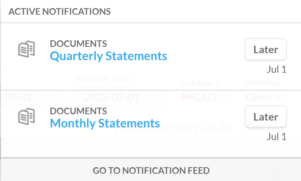Active Notifications is a list of notifications relevant to your immediate use of the app. The list displays notifications in reverse chronological order, with the most recent notification at the top. To open your Active Notifications simply click the bell icon in the top right-hand corner of any page in Client Portal.