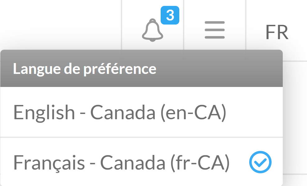 The language preference menu is where you select which language Client Portal uses to display data and information. You can select a language by clicking the language code in the top right-hand corner of any page, and then clicking any of the languages in the drop-down menu that appears.