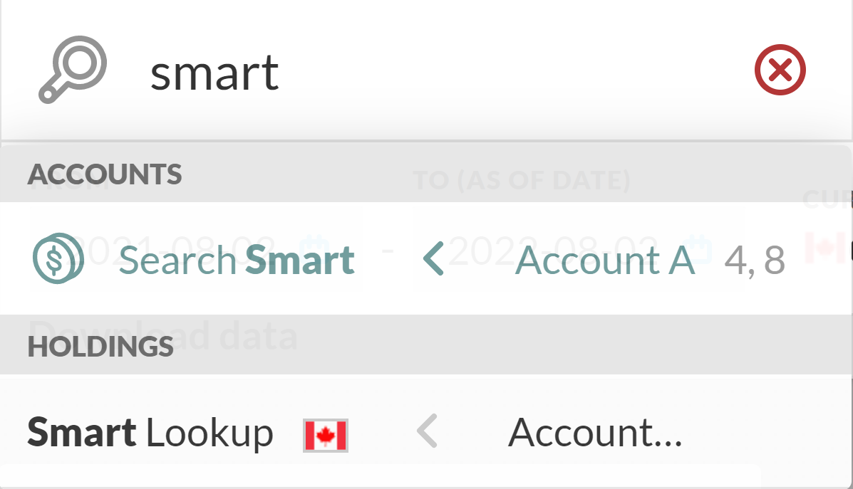 Smart Lookup returns a list of accounts, account groups, holdings, or documents in order of relevancy. In your Smart Lookup results dropdown: