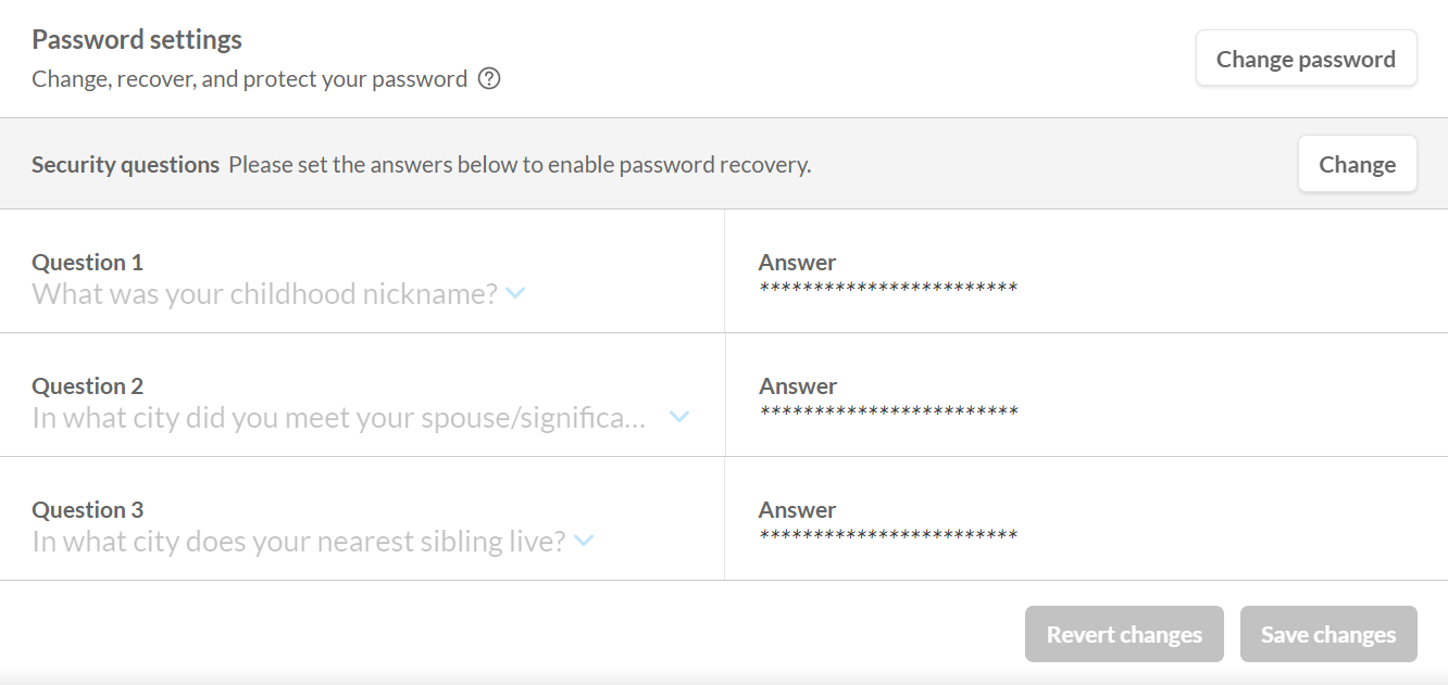 In the password settings menu, you can also set and change your security questions (you are prompted to answer your security questions via email if you click Forgot Password on Client Portal’s sign-in page).