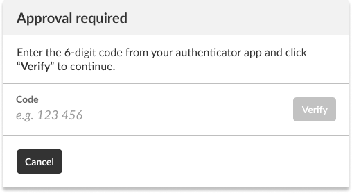The Approval required modal allows you to enter a 6-digit code to approve the change. Refer to your existing authenticator app for the code to enter here.