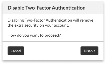 Click Disable button on the Disable Two-factor Authentication modal to confirm.