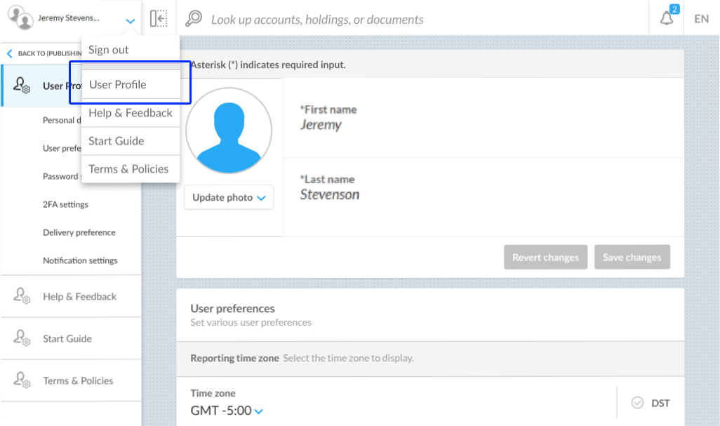 Sign in to Client Portal, navigate to the dropdown menu next to your name, and select User Profile.