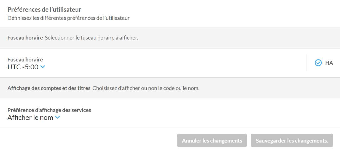 Vous pouvez aussi configurer l’heure avancée si vous voulez que les widgets et les espaces de travail affichent l’information à l’heure avancée. Pour activer ou désactiver l’heure avancée, cliquez sur l’icône du crochet située à côté du champ HA dans le menu Préférences de l’utilisateur. Quand l’heure avancée est activée, l’icône apparaît en surbrillance; quand elle est désactivée, l’icône apparaît en gris.