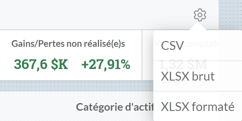 2. Cliquez sur le format dans lequel vous voulez télécharger les données (CSV brut, XLSX brut ou XLSX formaté) dans le menu qui s’affiche.