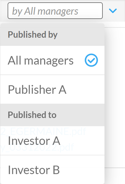 The Publisher filter opens a dropdown menu listing the names of users who have also made publications and the names of your investors who received publications. You can click any name so the list of publications only displays publications made by that colleague or received by that investor.