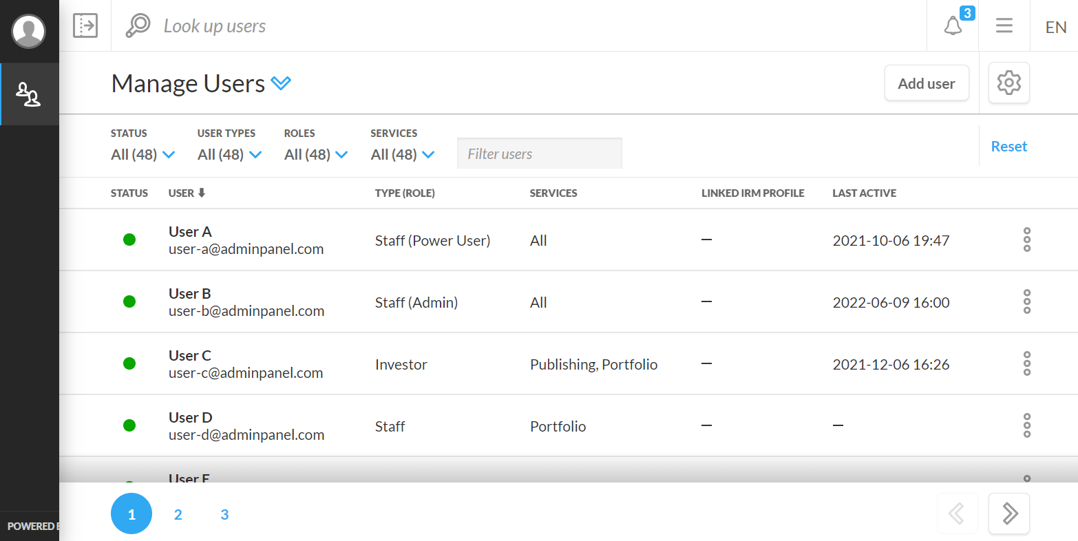 The Manage Users page is where you land when you first open the Admin Panel, an area in the app where admin users can oversee staff and clients within Client Portal.