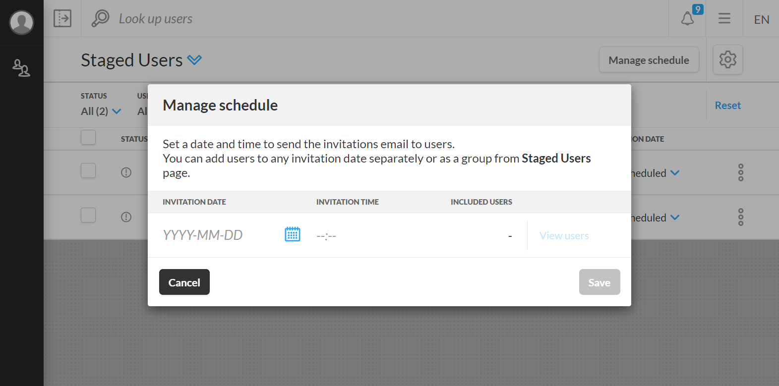 You can click View users to be redirected to a page listing only staged users for the scheduled date/time