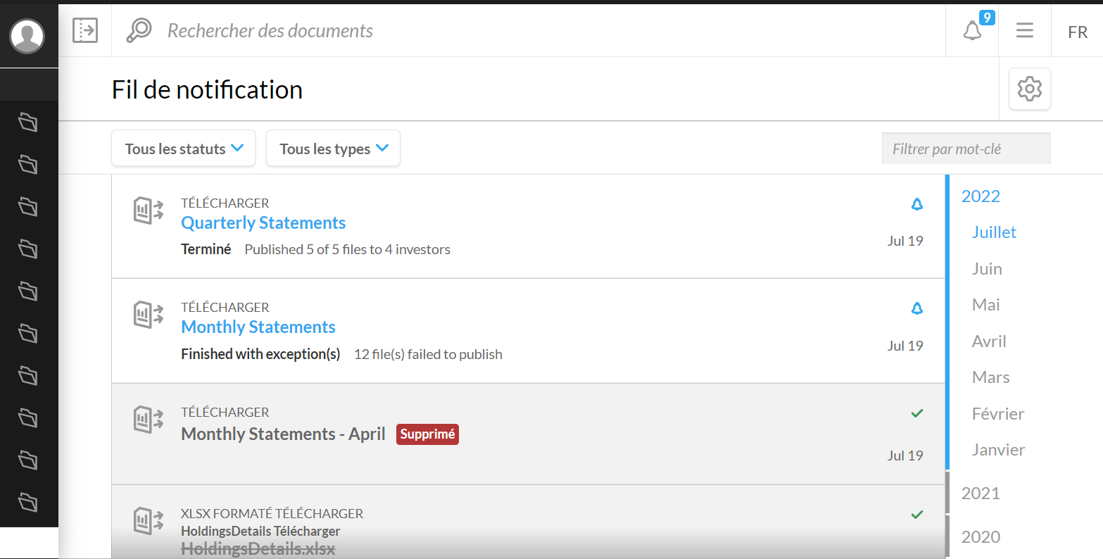 La page Fil de notification vous permet de filtrer vos notifications et d’effectuer des recherches en fonction de l’état, du type et de la date de la notification.