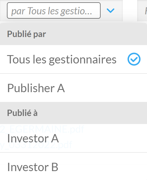 L’option Filtrer par gestionnaires permet d’ouvrir un menu déroulant avec la liste de vos collègues qui ont aussi fait des publications et les noms de vos investisseurs qui les ont reçues. Vous pouvez cliquer sur n’importe quel nom pour afficher uniquement les publications faites par ce collègue ou reçues par cet investisseur.